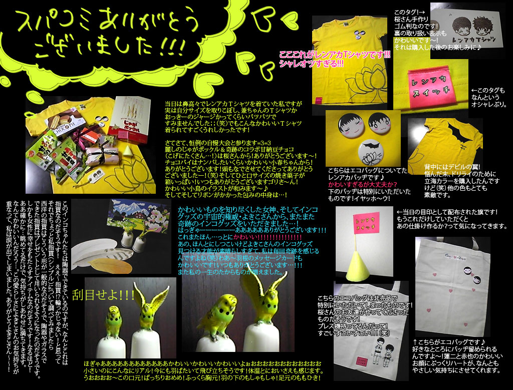 いらしてくださったみなさまと楽しくお話したりコスプレの方に見とれていたりしているうちに、気付けばもう午後になっていました。新刊の反省ですが、蓮赤本の方は自宅印刷だったので十分な数をご用意できずに申し訳ございませんでした;;そして今回のサナダーズは2冊セットだったので、いまいちわかりづらかったと思います…すみません(´_`。)次回はもっとわかりやすくしたいと思います。