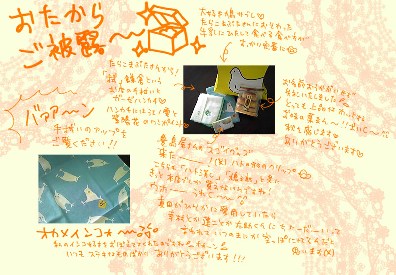 たらこまぶたさんにも久しぶりにお会いできて…!春以来でしたが、ぐっと素敵なお姉さんになっててビックリしたよ~う!自分が高校生になってから中学校に遊びにいったとき、先生が「女子はあっというまに変身する」と言ってたことが心で理解できたよ~!(笑)またまた素晴らしすぎるおみやげをいただいて、開けた瞬間雄叫びを上げました(笑)うおおおおおーかわいい…!ああ憧れの鎌倉のかほりが…v いつもセンスあふれるかわいいものをたくさん…ありがとうございます(;v;) たらこまぶたさんのやさしいお心が伝わってくるあたたかなお手紙も読ませていただいて、私というやつは…ほんとにしあわせすぎます。お返事書きたくて仕方ないので(笑)待っててやってください!テニミュ最っ高ですよね!!!もう~まよ~いはない~おれの~よ~ゆ~う~♪(どんなメドレーじゃい笑)