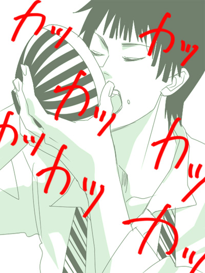 今日のラクガキは、牛丼(注:どんぶりものなら何でも可)をかっこむ柳先輩です!とうとう描きました!(笑)このあと手の甲で口元ぬぐっちゃったりします!もしかしたらやかんの口からお茶飲んじゃうかもしれません!