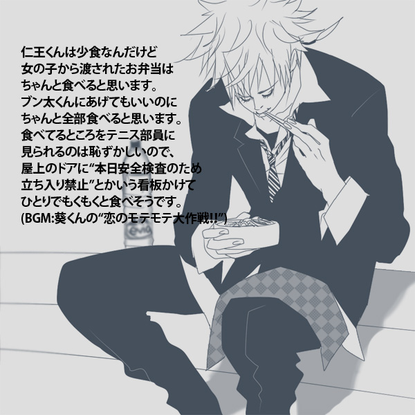 真田はおいしそうに食べる人だと思います♪とくにおにぎりとかおコメとかごはんとか(笑)幸村はお魚食べるのが上手ですよねきっと!骨だけがきれーいに残ってる!仁王くんはいっぱい残しそう~><;でもいつもミネラルウォーターいっぱい飲んでるイメージが…。モデル?(笑)